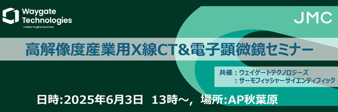 産業用X線CTのウェイゲート・テクノロジーズと⾛査電⼦顕微鏡のサーモフィッシャーサイエンティフィックの共催セミナーです。近年、より⾼解像度の需要が⾼まる中で、数100μm-1μm以下のX線CTによる⾮破壊検査と、その結果から更に数ナノレベルでの詳細な観察が可能なSEMのそれぞれの特⻑や運⽤事例を解説致します。